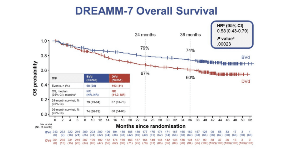 - DREAMM-7 trial shows sustained overall survival benefit for Blenrep (belantamab mafodotin) combination versus daratumumab combination; benefit seen early and maintained through follow-up.