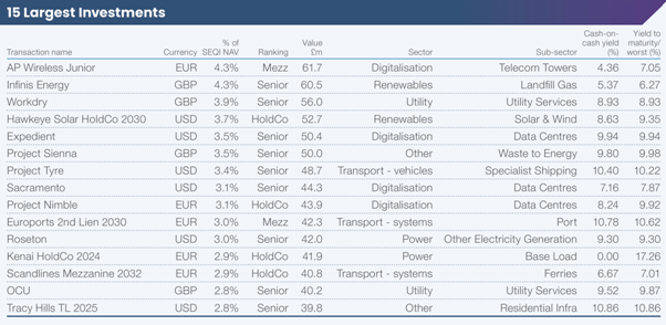 - SEQI is the U.K.’s largest listed debt investor, investing in economic infrastructure private loans and bonds across a range of industries in stable, low-risk jurisdictions, creating equity-like returns with the protections of debt.